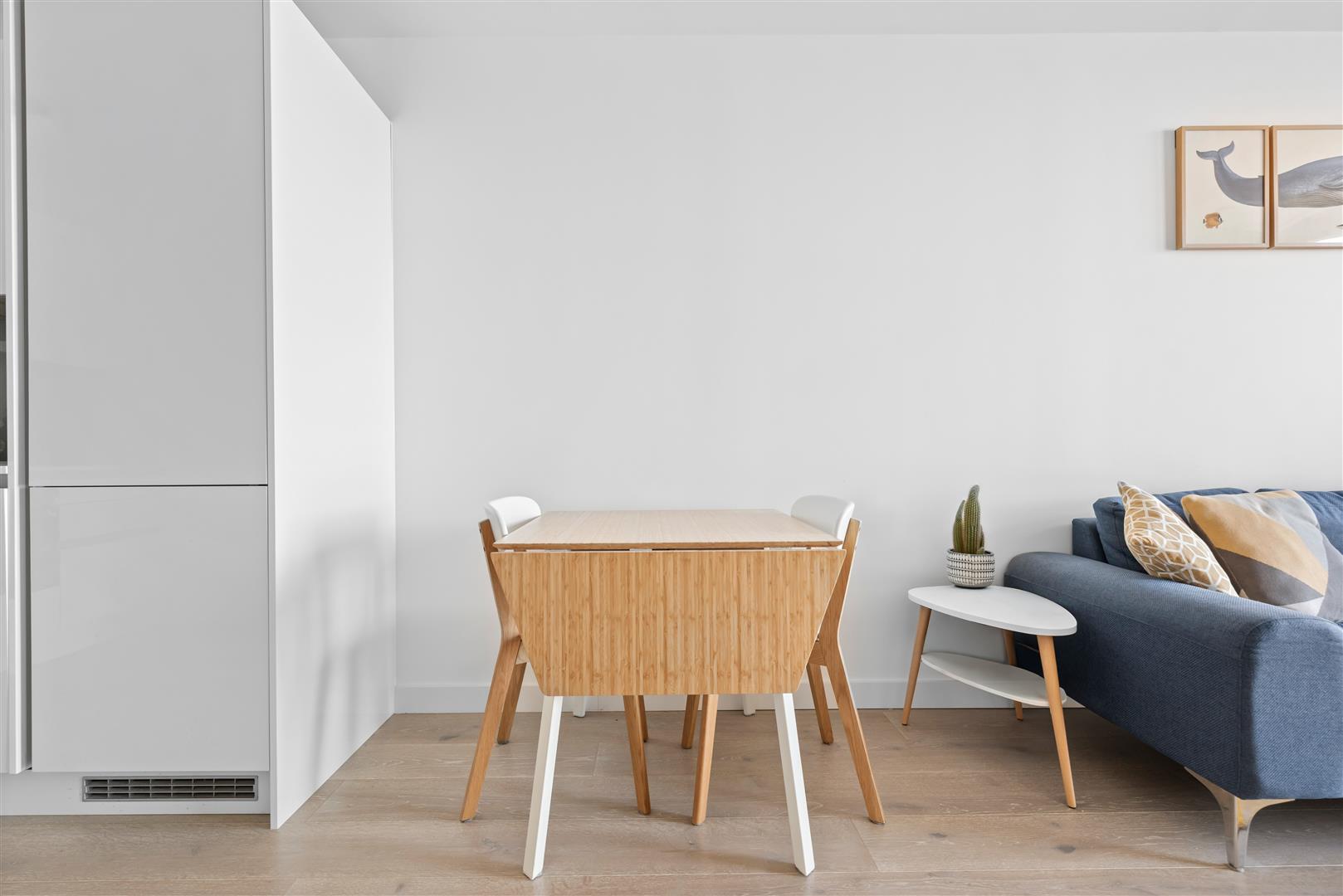 The kitchen features streamlined cabinetry and integrated appliances forming a simple, well-resolved backdrop. The overall layout is well balanced, allowing each space to function comfortably without feeling overworked.