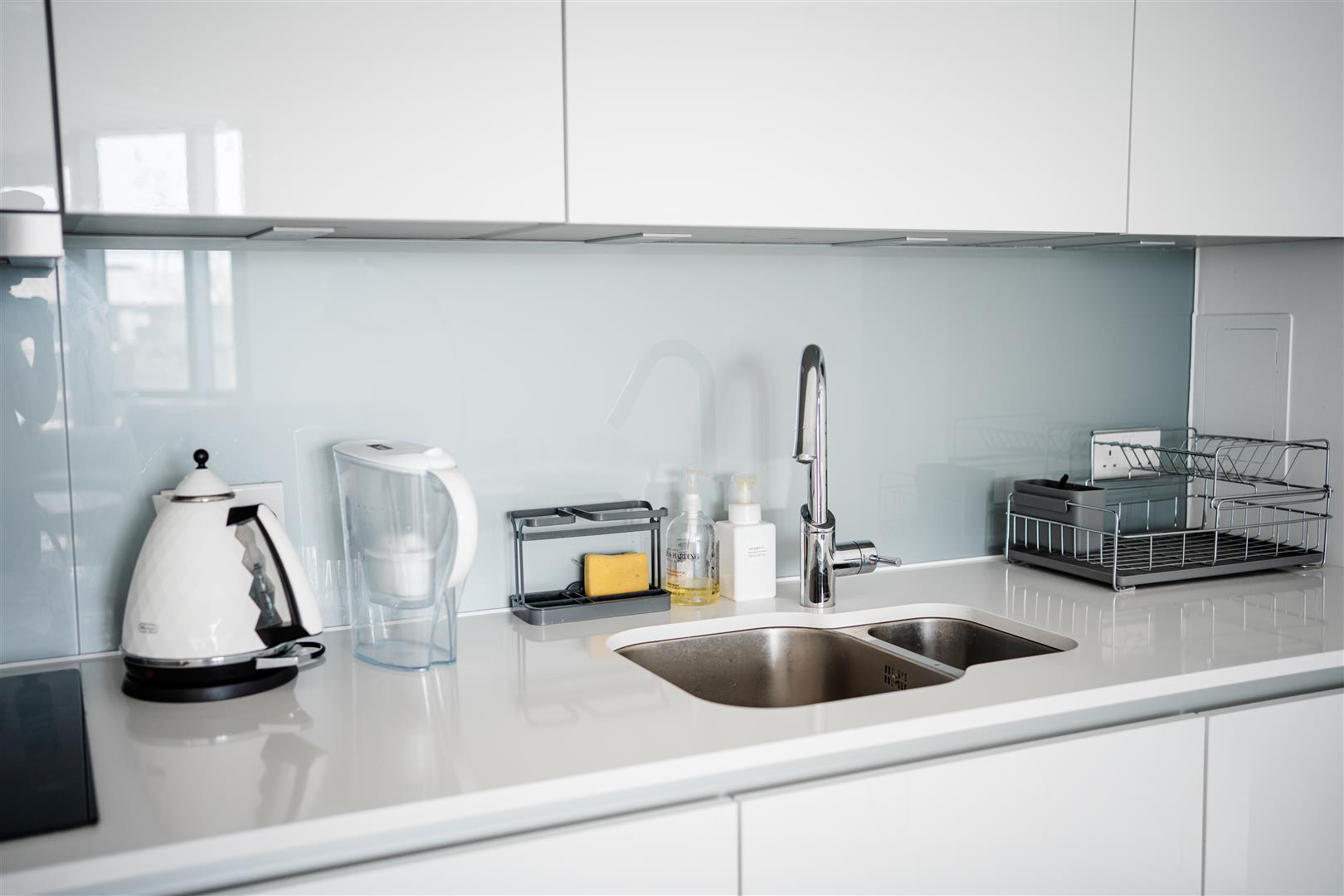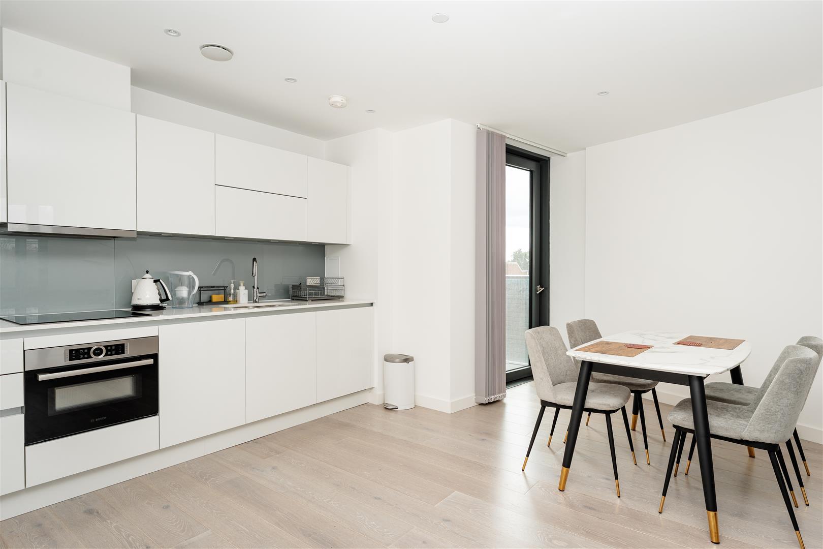 The heart of the home is a stunning open plan reception and kitchen, with full height glazing and direct access to a private balcony. The generous space is perfectly zoned for lounging, dining, and entertaining, while engineered wood flooring and a crisp neutral palette enhance the apartment’s contemporary finish. The kitchen is fitted with handleless cabinetry, integrated Bosch appliances, and a sleek glass splashback – equally stylish and functional.