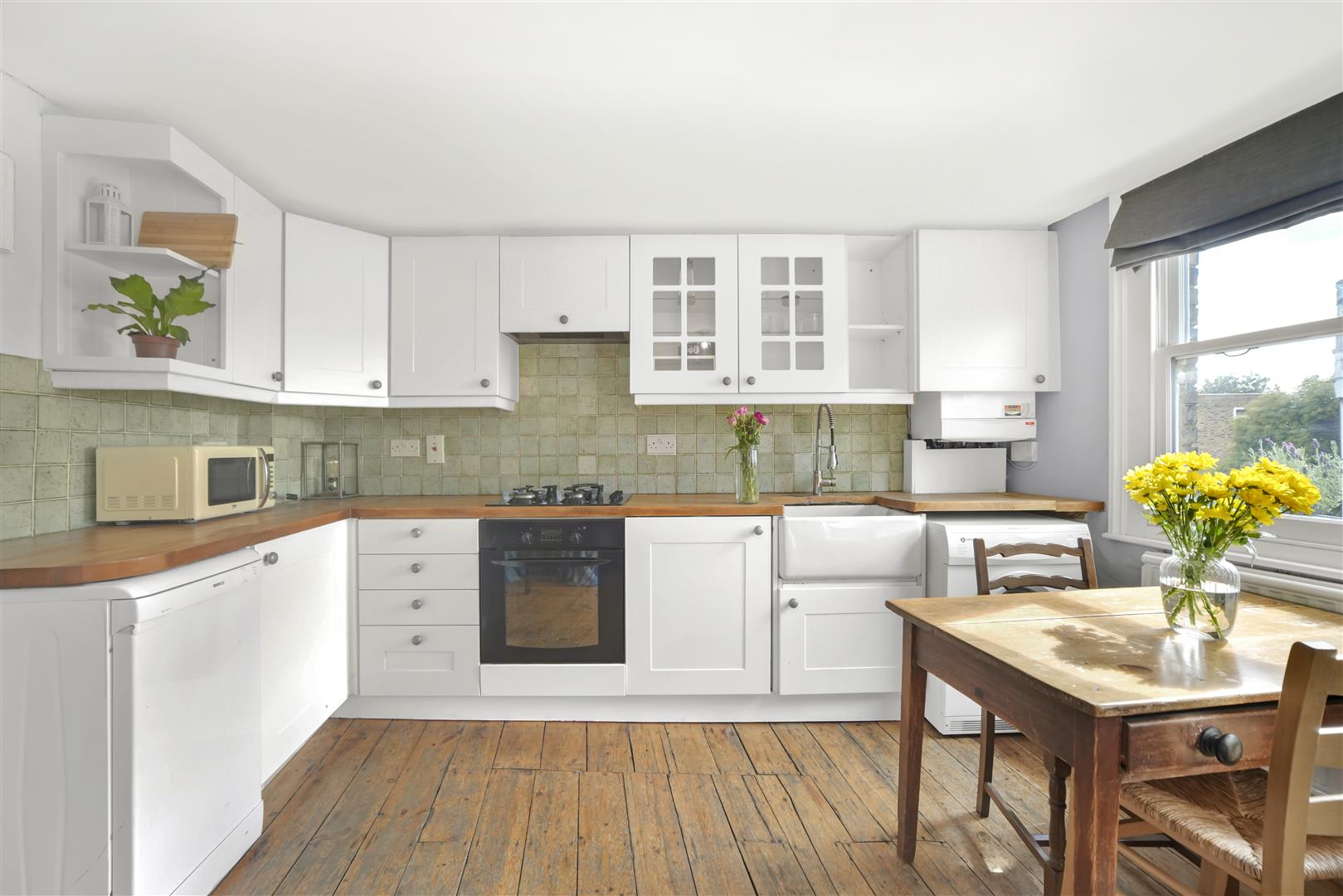 The heart of the home is the open plan reception and kitchen, where large sash windows draw in natural light and frame lively street views. Warm wooden flooring runs throughout, complementing the clean lines of the contemporary kitchen, which comes complete with shaker style cabinetry, wooden worktops, and a deep Belfast sink. There’s ample room here to dine, work, and relax, with enough flexibility to create your own layout.