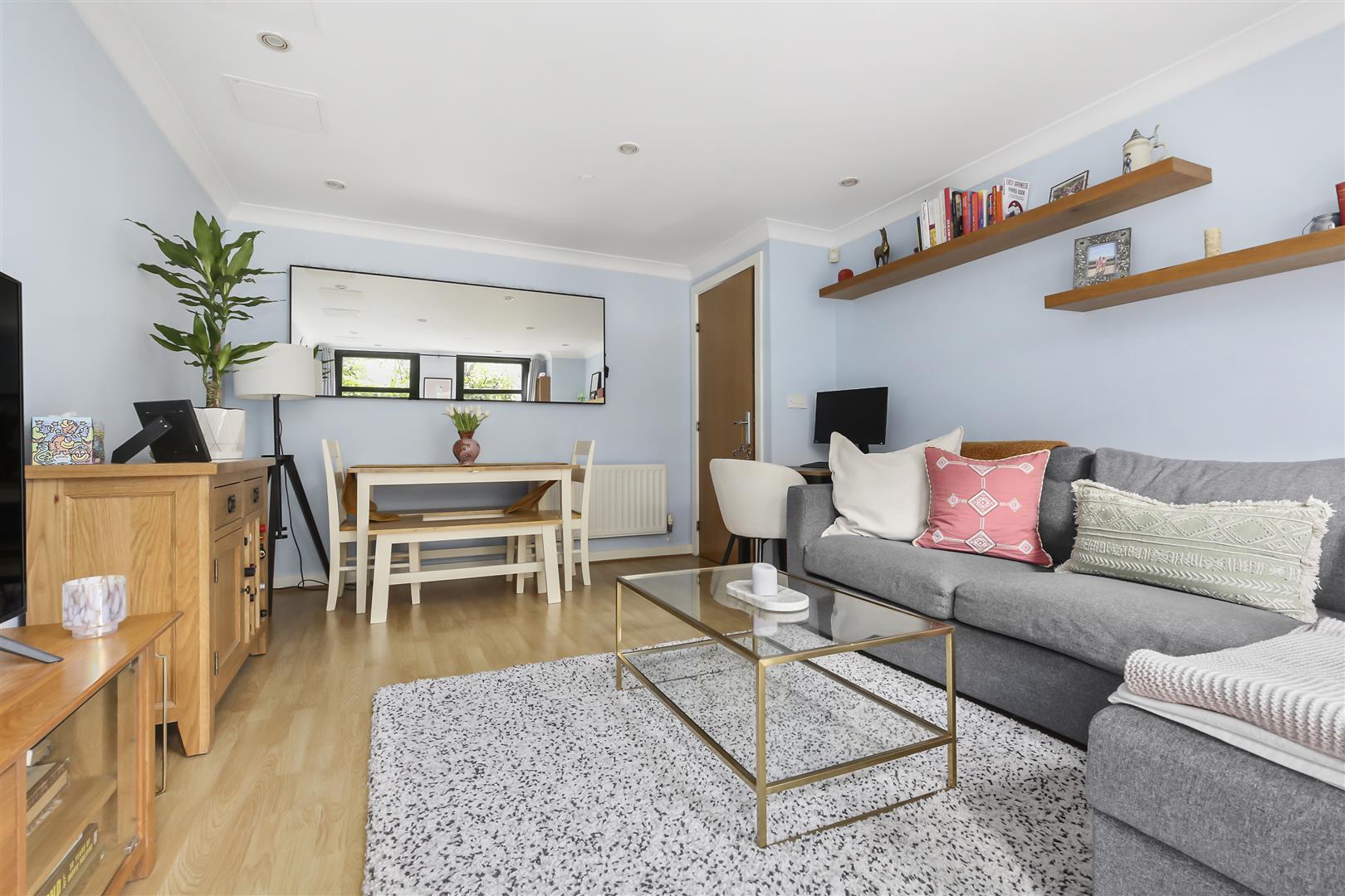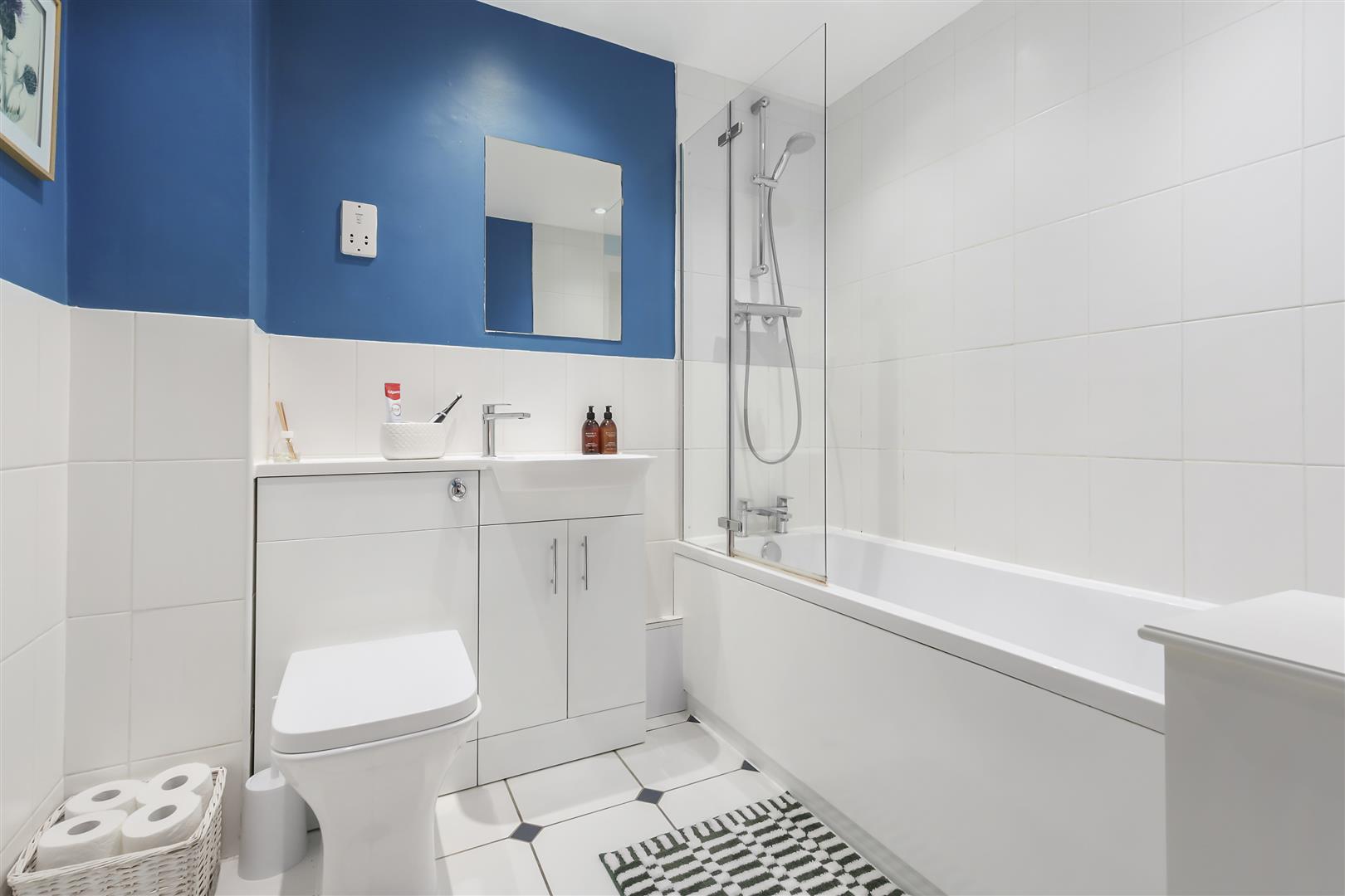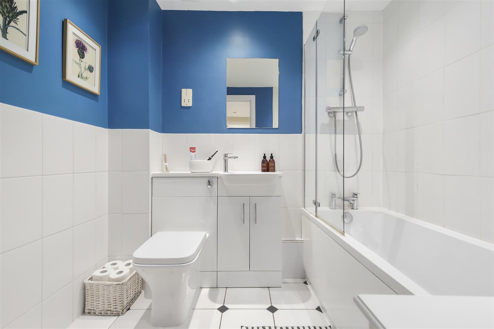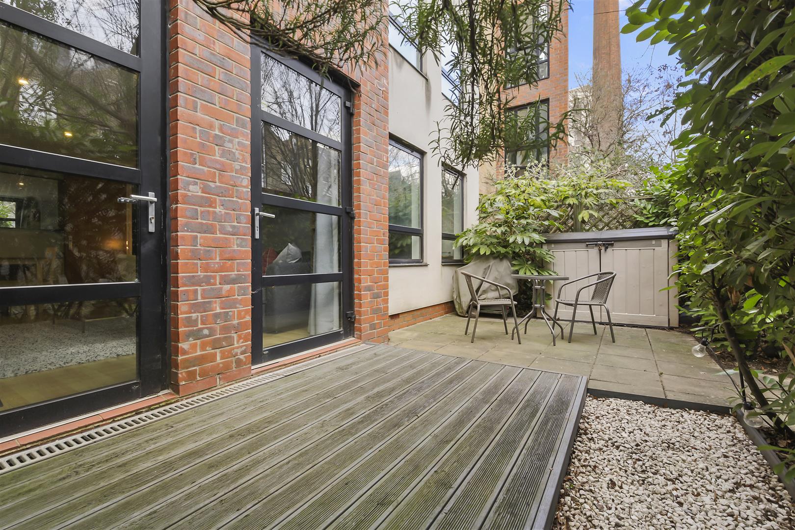 The double bedroom is quietly positioned and generously sized, offering pleasant green outlooks and plenty of room for a full bedroom furniture set. The bathroom is finished in a crisp, modern style, with a full-size bath, overhead shower, vanity storage and neutral tiling throughout. Externally, the private garden is a real highlight, combining decked and paved areas bordered by mature planting for privacy — ideal for morning coffee or relaxed summer dining.