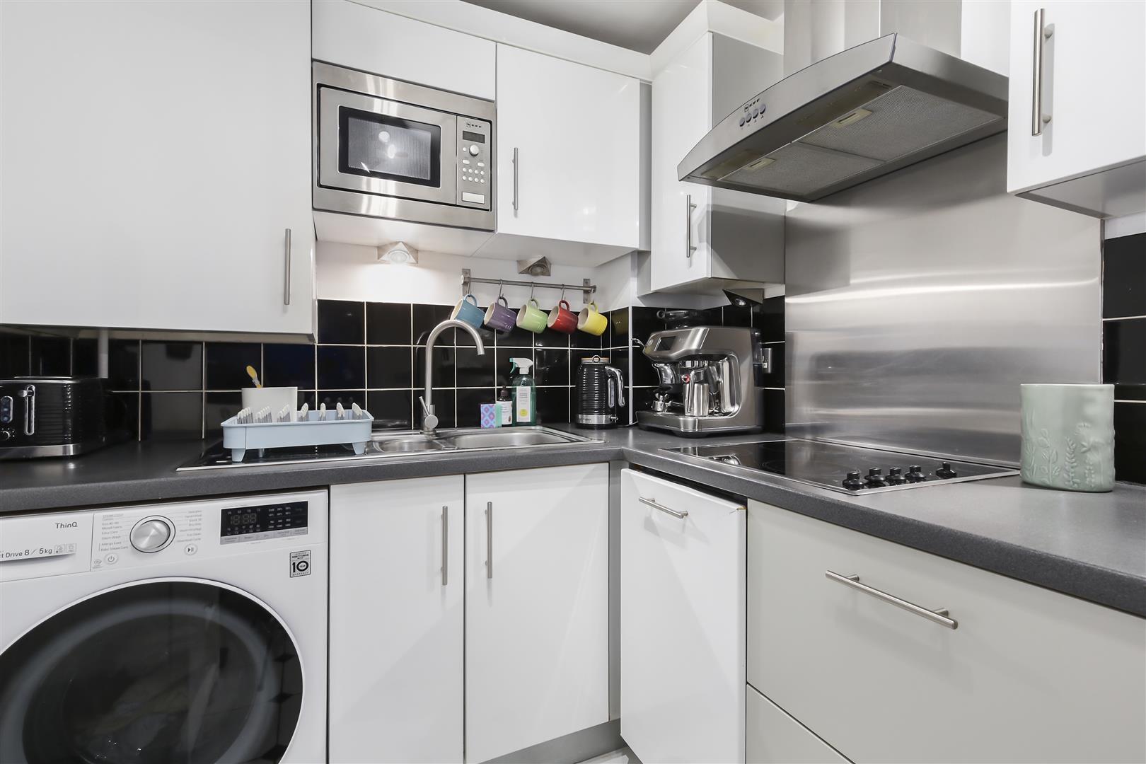 The separate kitchen sits just off the hallway and is fitted with clean, modern cabinetry, contrasting worktops and integrated appliances. Tiled flooring and splashbacks ensure the space remains functional and easy to maintain.