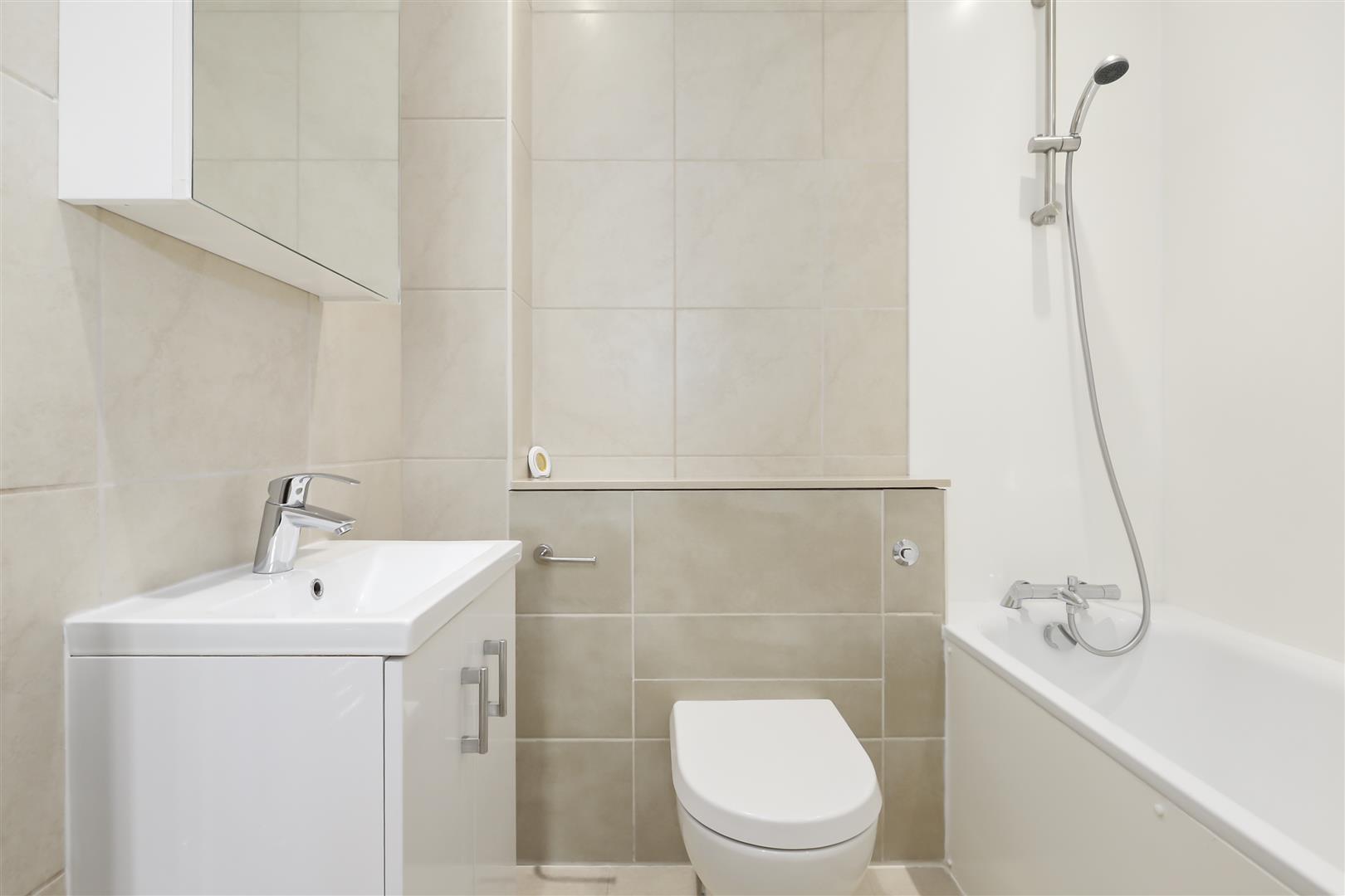 The bedroom is peaceful and well presented, complemented by a large sash-style window. The sleek modern bathroom features neutral stone tiling, chrome fittings and a full-sized bath with an overhead shower.