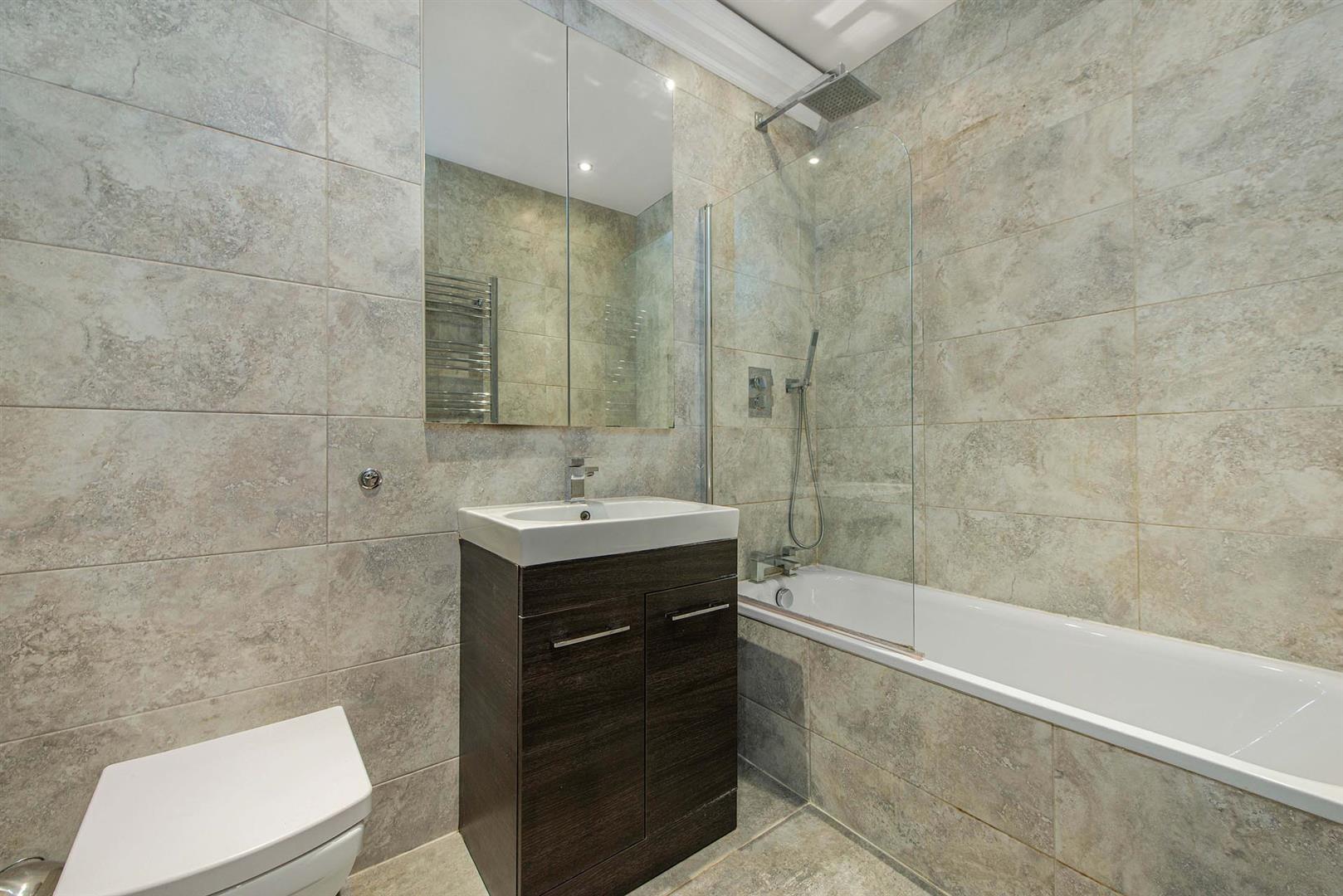 The bathroom is finished to a high standard, featuring large stone-effect tiles, a full-size bath with overhead shower, contemporary chrome fittings and excellent built-in storage, including a vanity unit and mirrored cabinet.