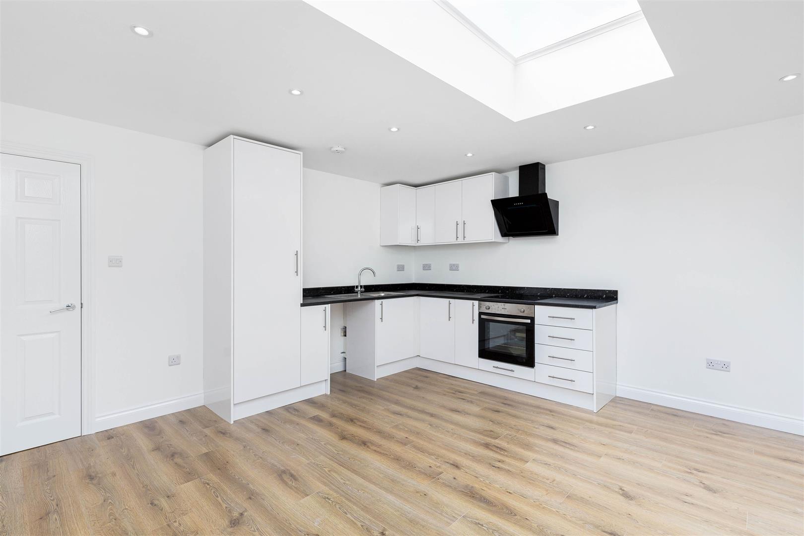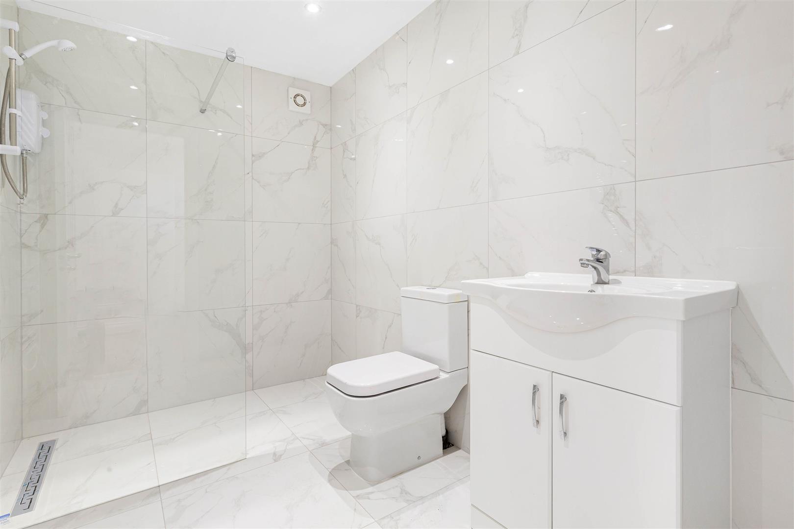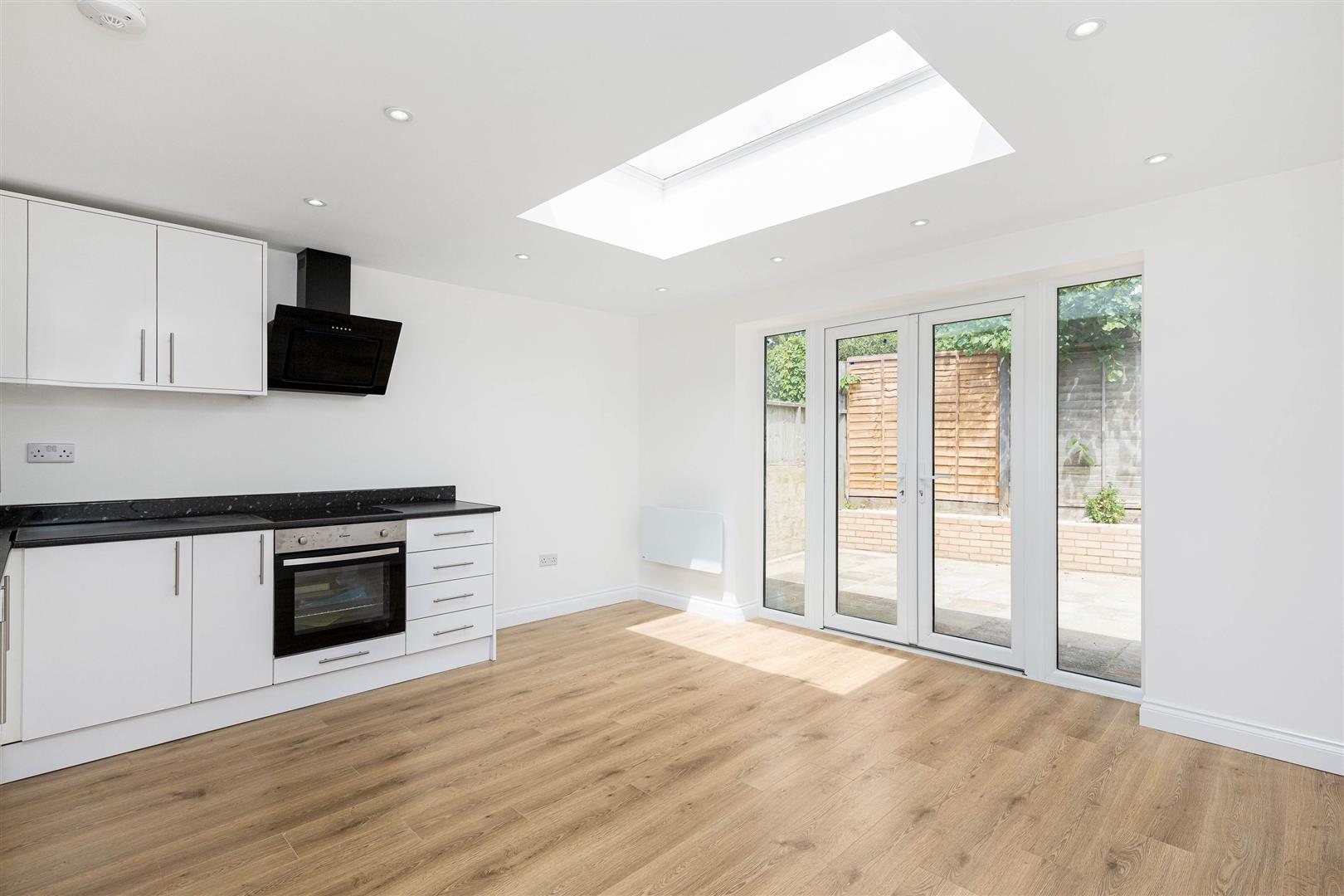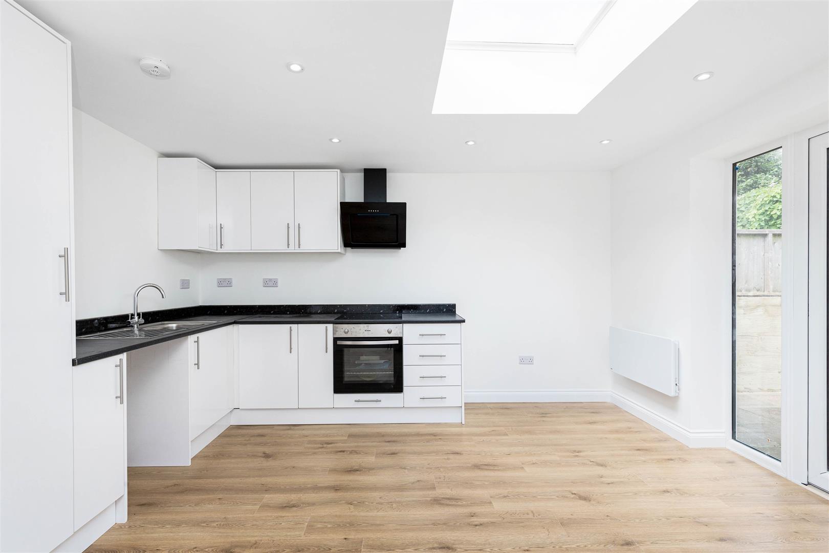 Next door sits the bathroom, with extraordinary floor-to-ceiling marble effect oversized tiling, sink with cabinet and large walk in shower for extra luxurious ablutions. The open plan kitchen and reception room resides towards the rear of the property, with large skylight and double French windows that let sunlight spill out over the space.