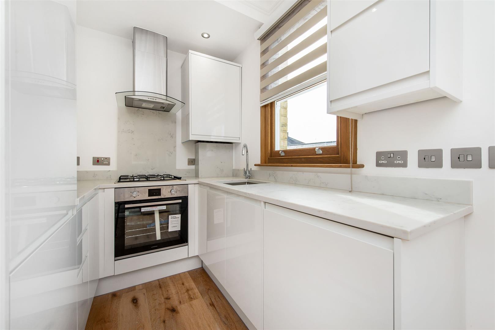Back into the hallway and to your right, discover the open plan kitchen and living room adjacent complete with more clean white walls and laminate flooring. Four wood surround windows pour natu-ral light over the space, while a windowed door hosts views out over the flat roof and Athelstane Mews below from your Juliet balcony.