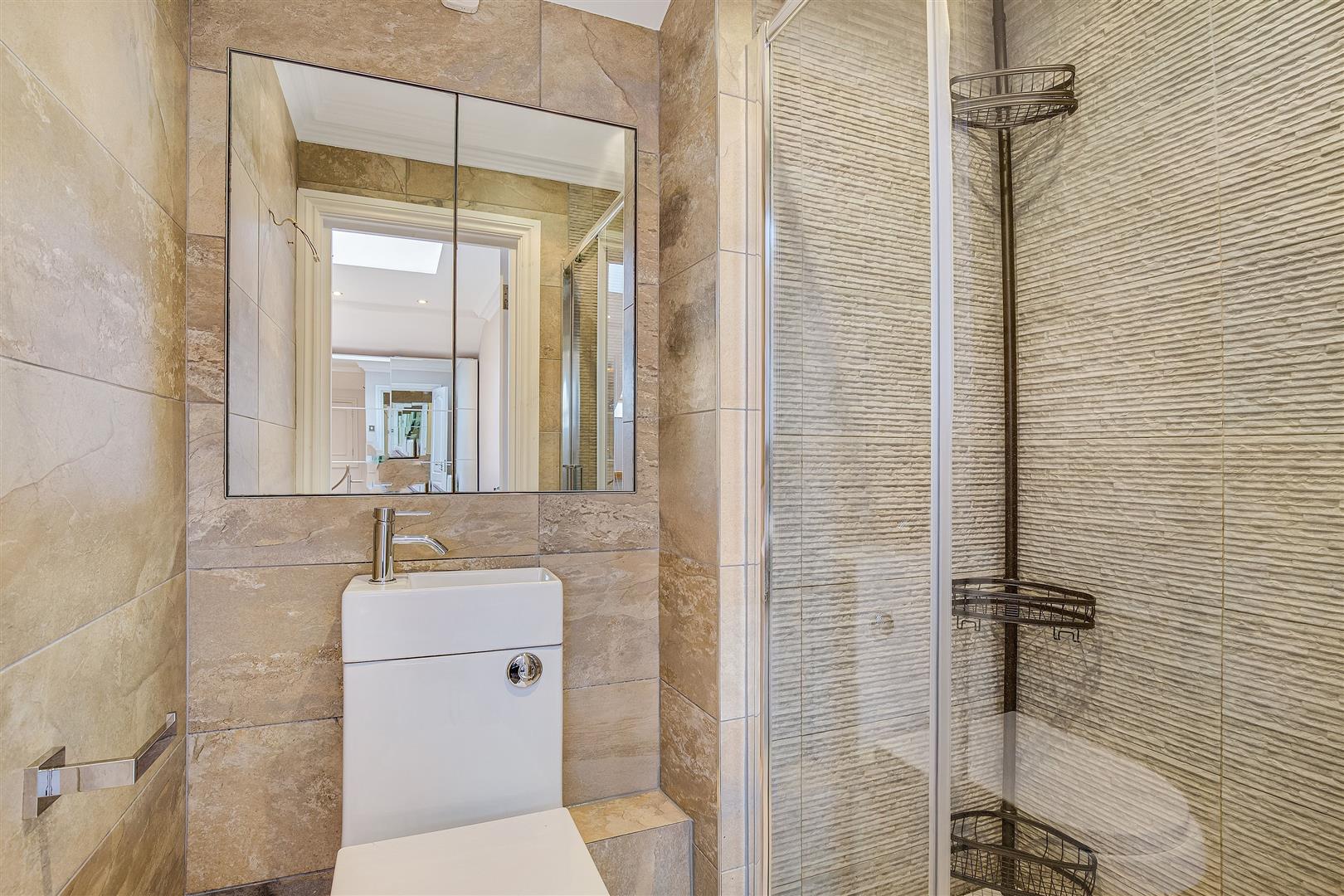 Taking the attractive spiral staircase to the top floor, your en-suite double bedroom awaits, complete with cosy grey carpeting and two skylights. More storage sits above the staircase, the Eaves and within two mirrored wardrobes creating a sense of spaciousness. What’s more, a TV sits built within the bed frame. Your en suite shower room resides towards the rear, awash with sumptuous stone effect tiling and chrome fittings.