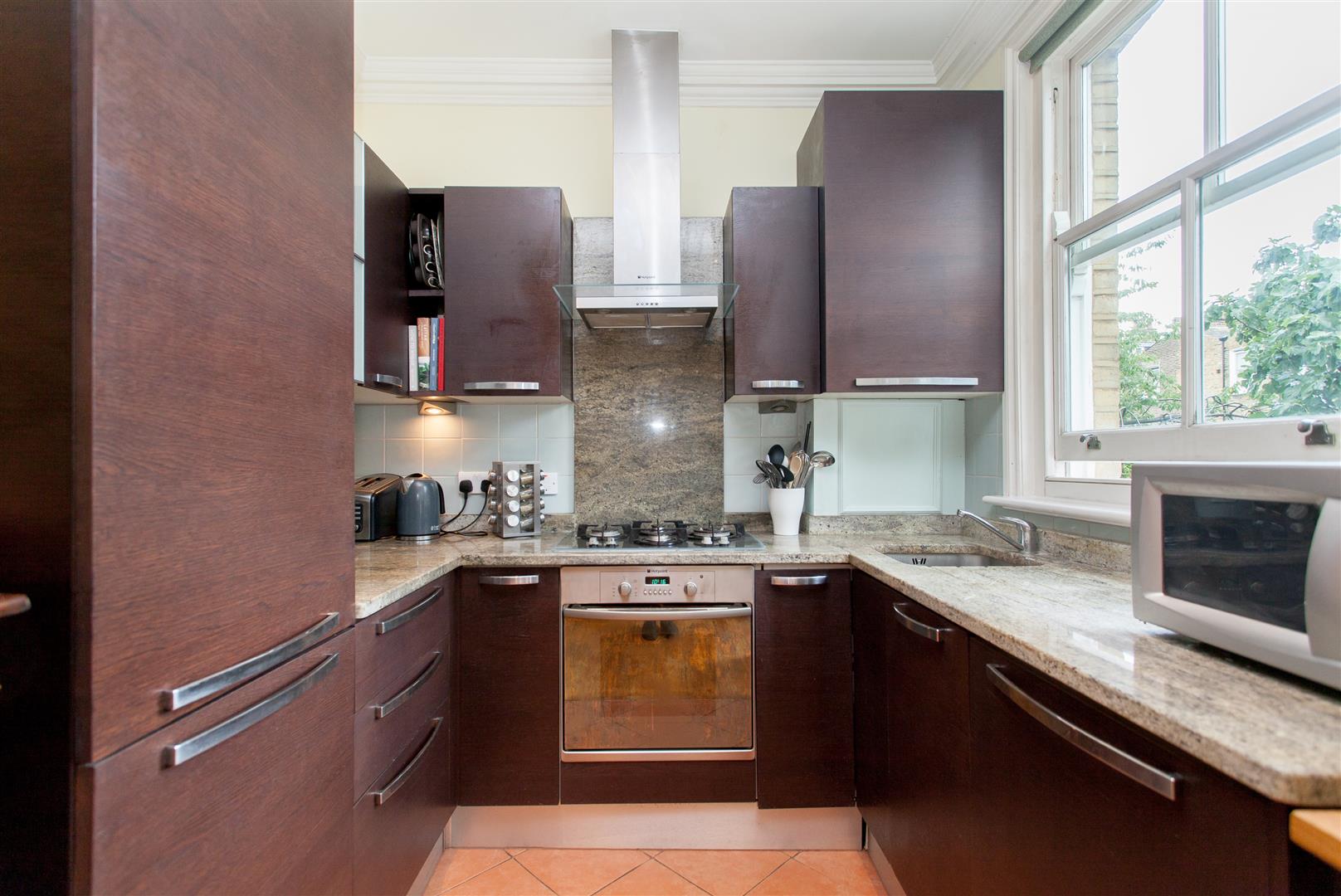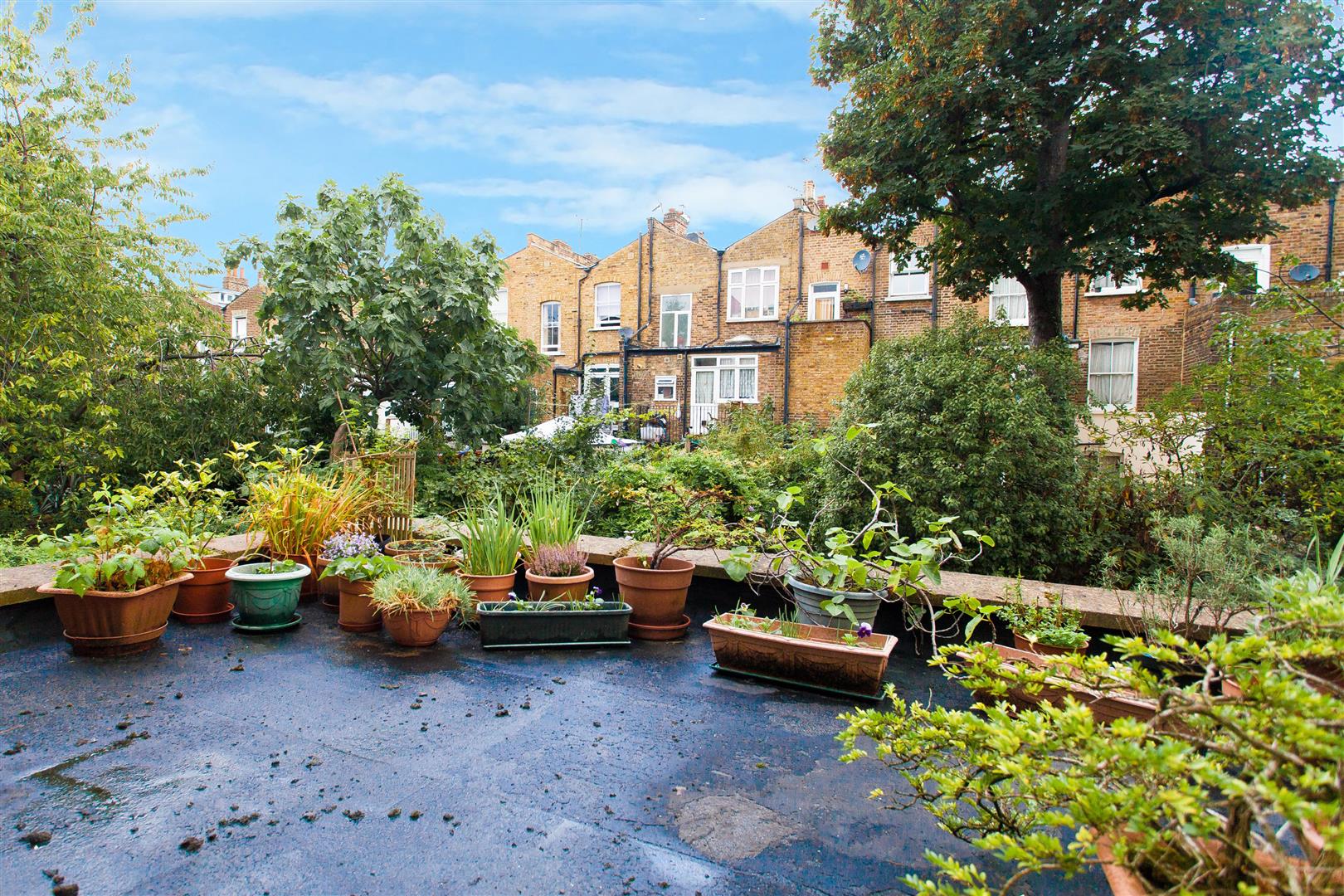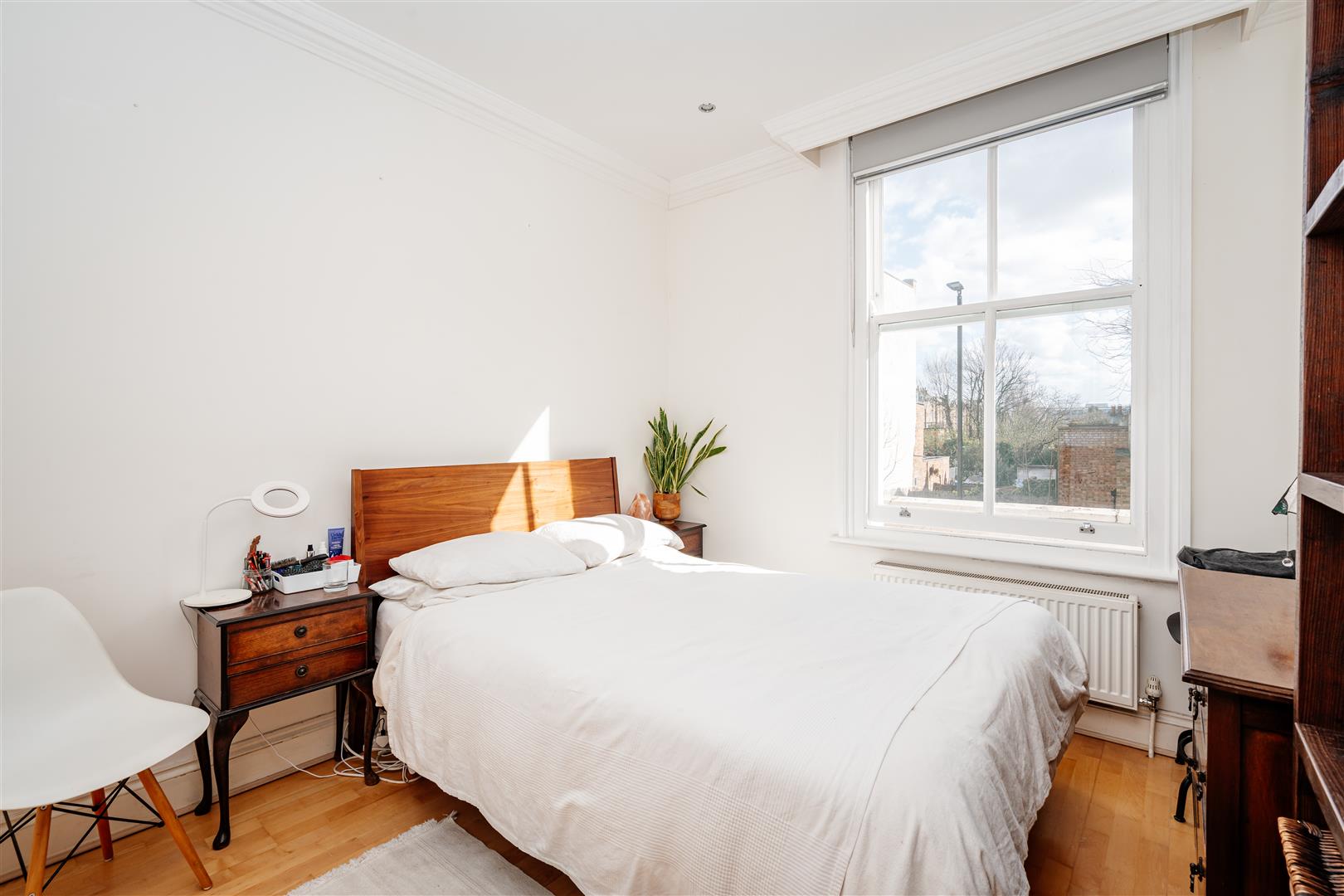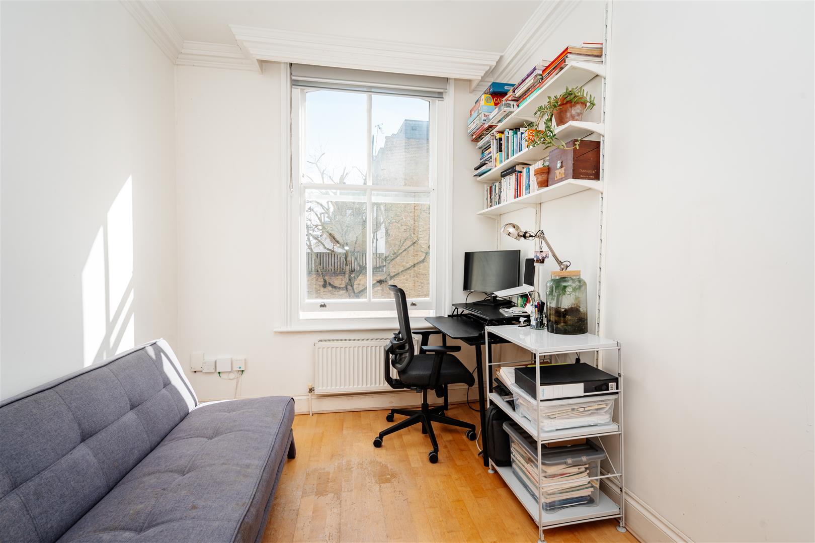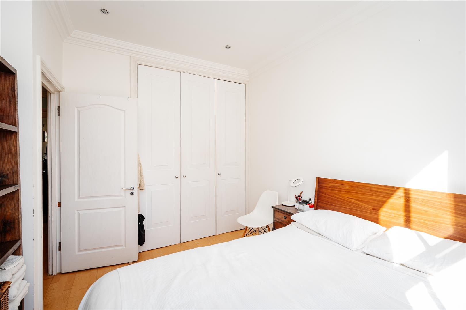 Original Victorian features and contemporary fittings complement each other throughout, not least in the bright, open plan kitchen / dining and reception room. Here you’ll find sleek solid wood flooring and pale lemon walls illuminated by floor to ceiling panelled windows lending access to your private roof terrace beyond. To your left, handsome cabinets line two walls of the kitchen area, hosting light granite worktops, integrated hob / oven, plentiful storage space and recessed spot lighting found across the property. Here you’ll find plentiful space to merge living and dining with enviable leafy views over neighbouring treetops and your own private roof terrace. A sandy colour palette adorns the bathroom adjacent, finished to perfection with full-sized bathtub, luxurious heated towel rail and countertop ceramic washbasin. After passing more storage options in the hallway, you’ll discover the master bedroom in clean ivory, complete with sash windows and a wall of inbuilt wardrobes. Next door lies the second bedroom, currently used as a home office with space for desk, storage, day bed and shelving above. This room also boasts a wall of inbuilt cupboards, ideal for doubling up as a walk in wardrobe. Located just 0.6 miles from Finsbury Park Station, this two bedroom home offers the ideal starter home for first time buyers.