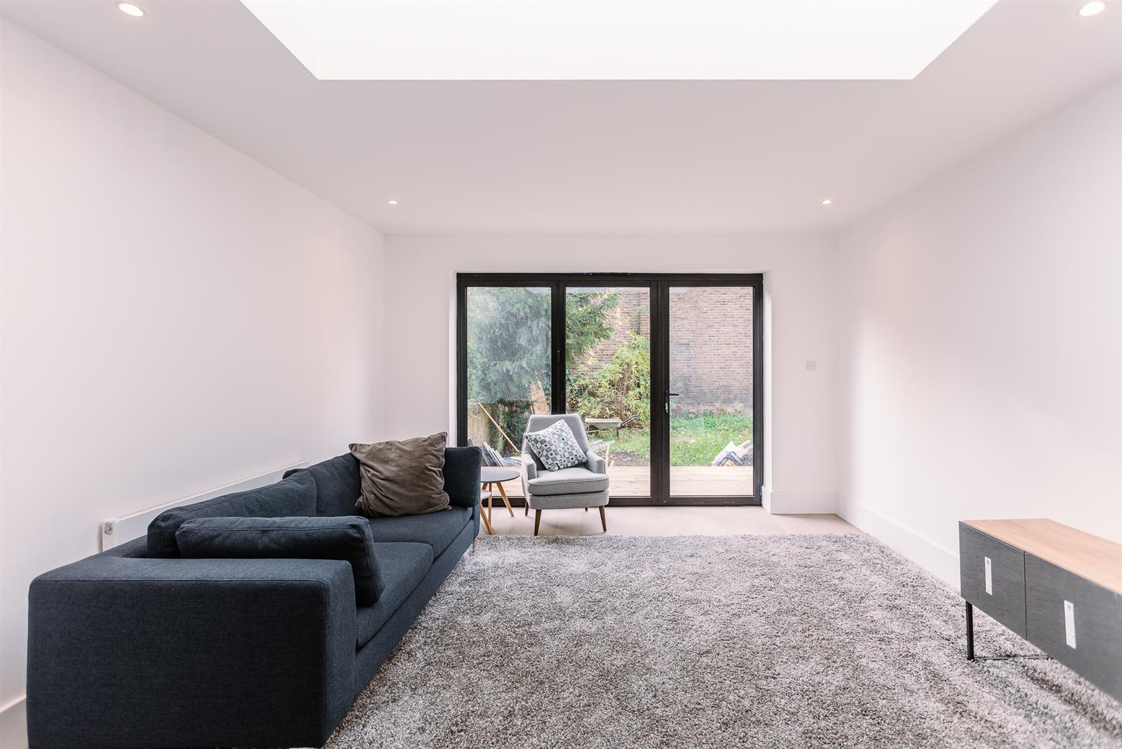 Neutral decor within lets original features sing, such as the cornicing, fireplace and sash windows in the reception room. Here you’ll find handsome hardwood floors and two sofas, with views out across the garden beyond.