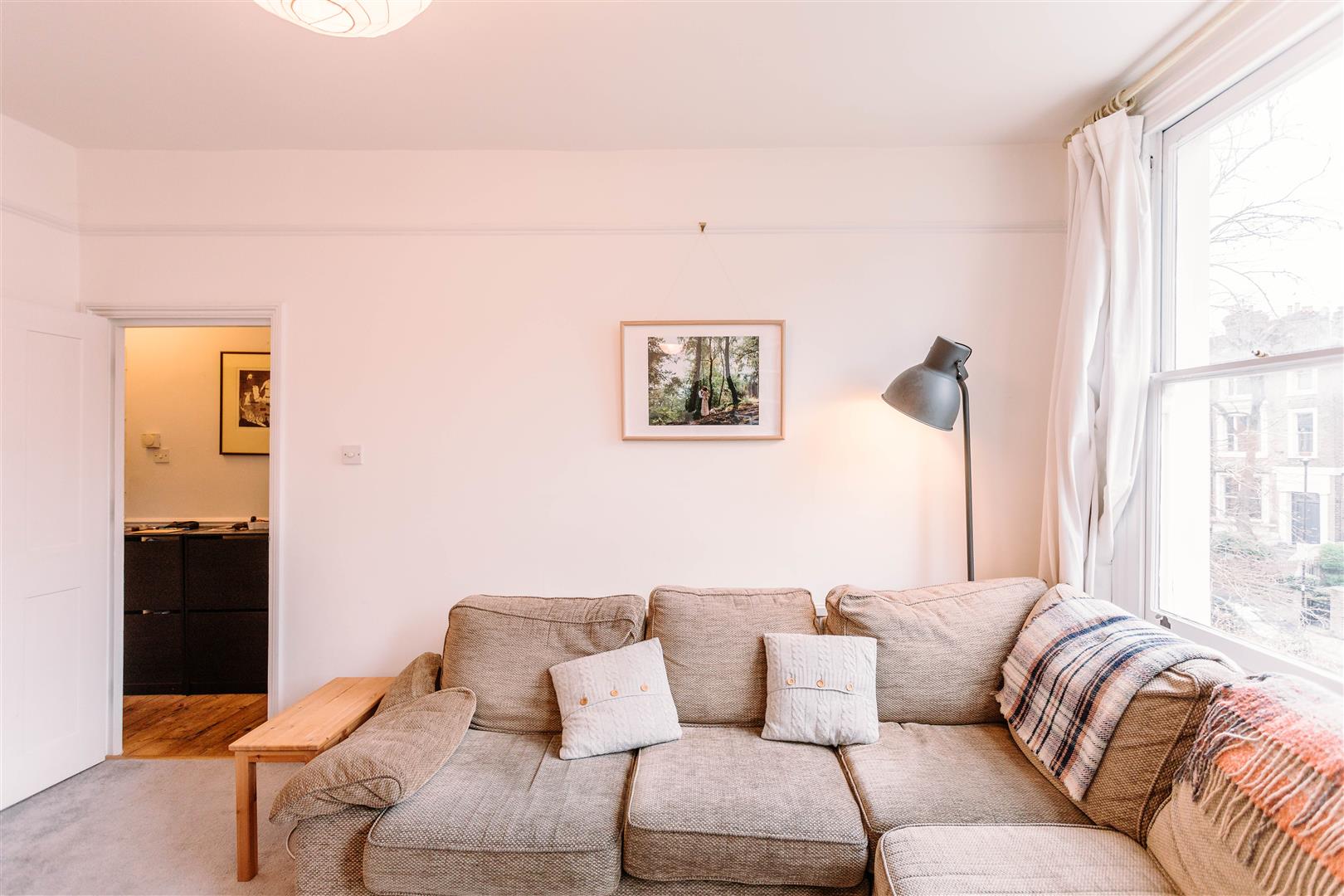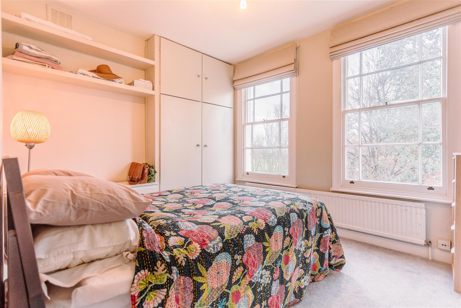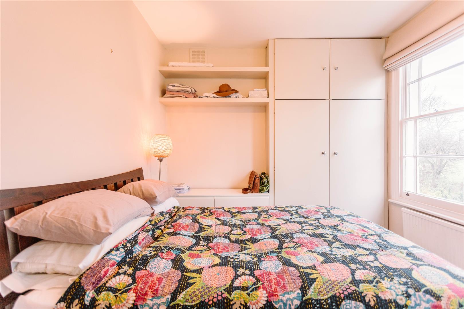 The bedroom is quietly positioned to the rear of the property, overlooking greenery and offering a peaceful retreat. Built-in storage and shelving maximise space while maintaining a clean, uncluttered feel. The bathroom is neatly finished with a full-size bath and overhead shower, contemporary tiling and vanity storage. This is a bright, well balanced period apartment in a prime North London location, offering character, comfort and excellent connectivity.