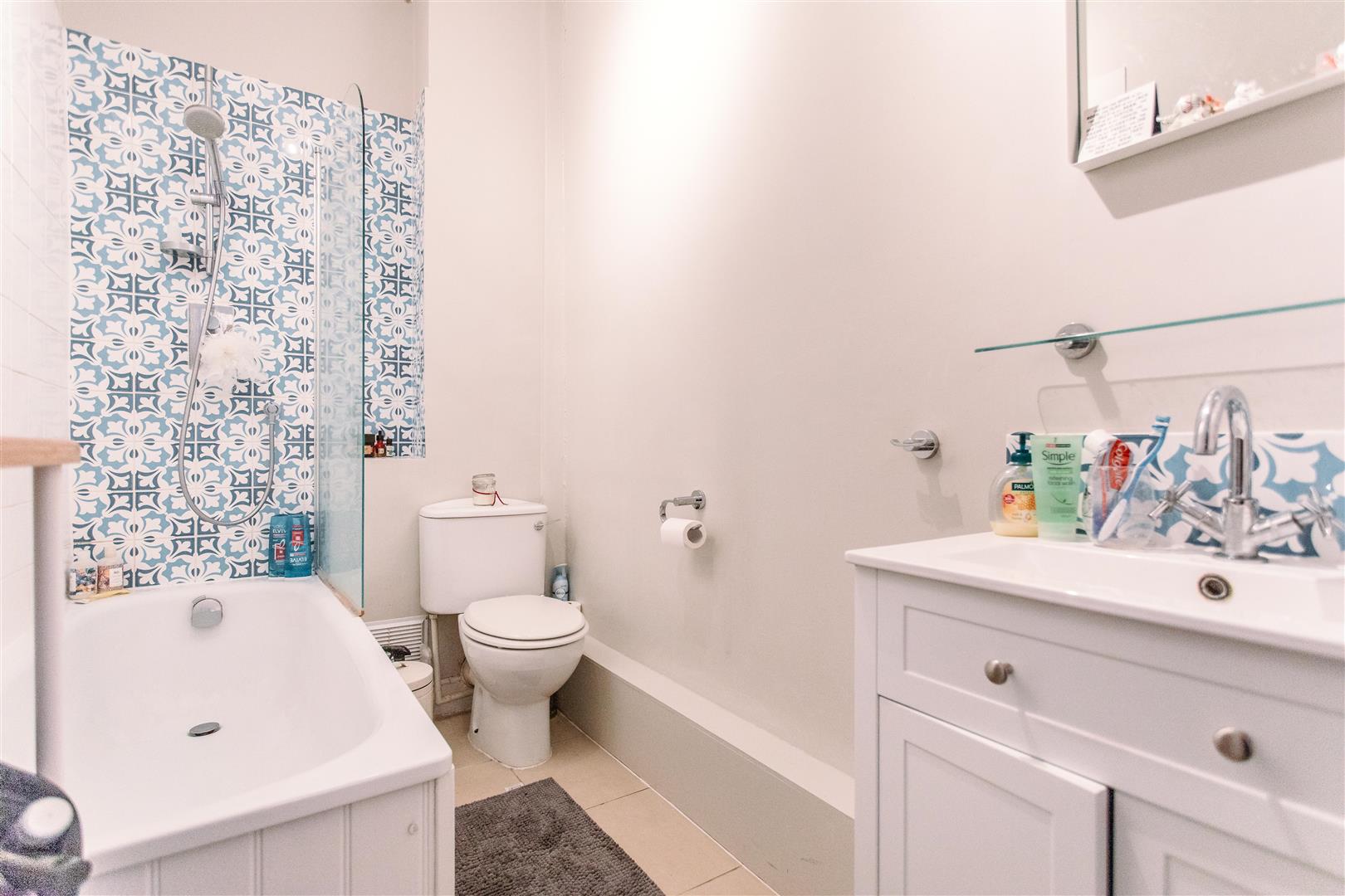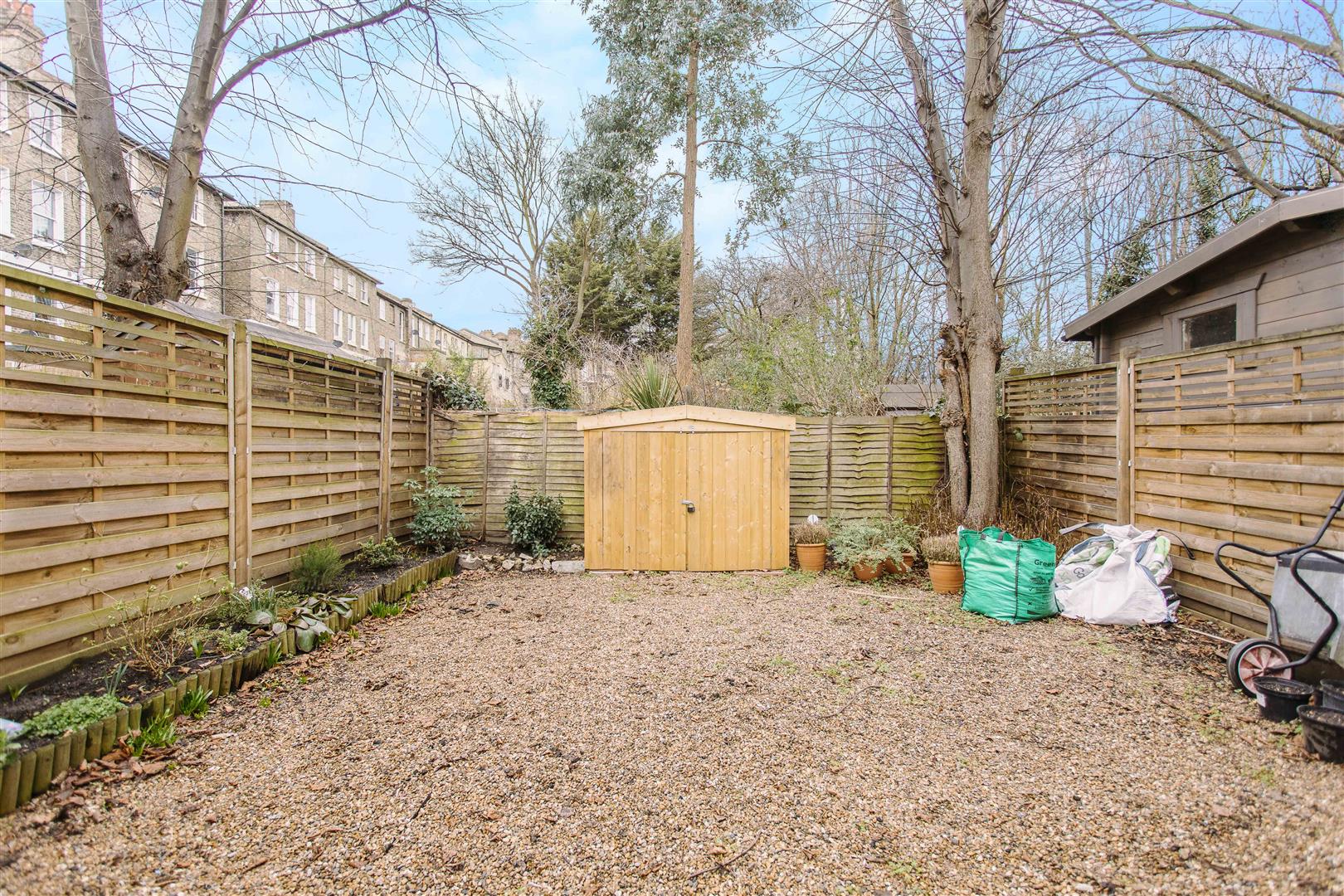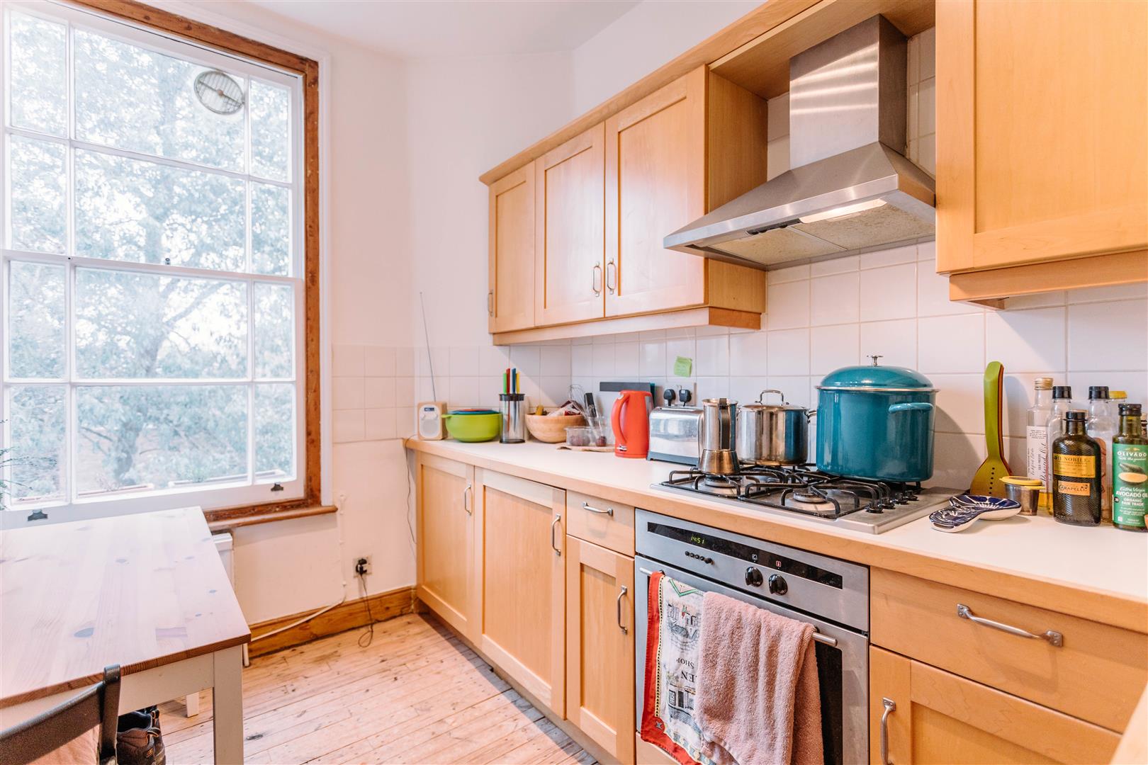 The bedroom is quietly positioned to the rear of the property, overlooking greenery and offering a peaceful retreat. Built-in storage and shelving maximise space while maintaining a clean, uncluttered feel. The bathroom is neatly finished with a full-size bath and overhead shower, contemporary tiling and vanity storage. This is a bright, well balanced period apartment in a prime North London location, offering character, comfort and excellent connectivity.