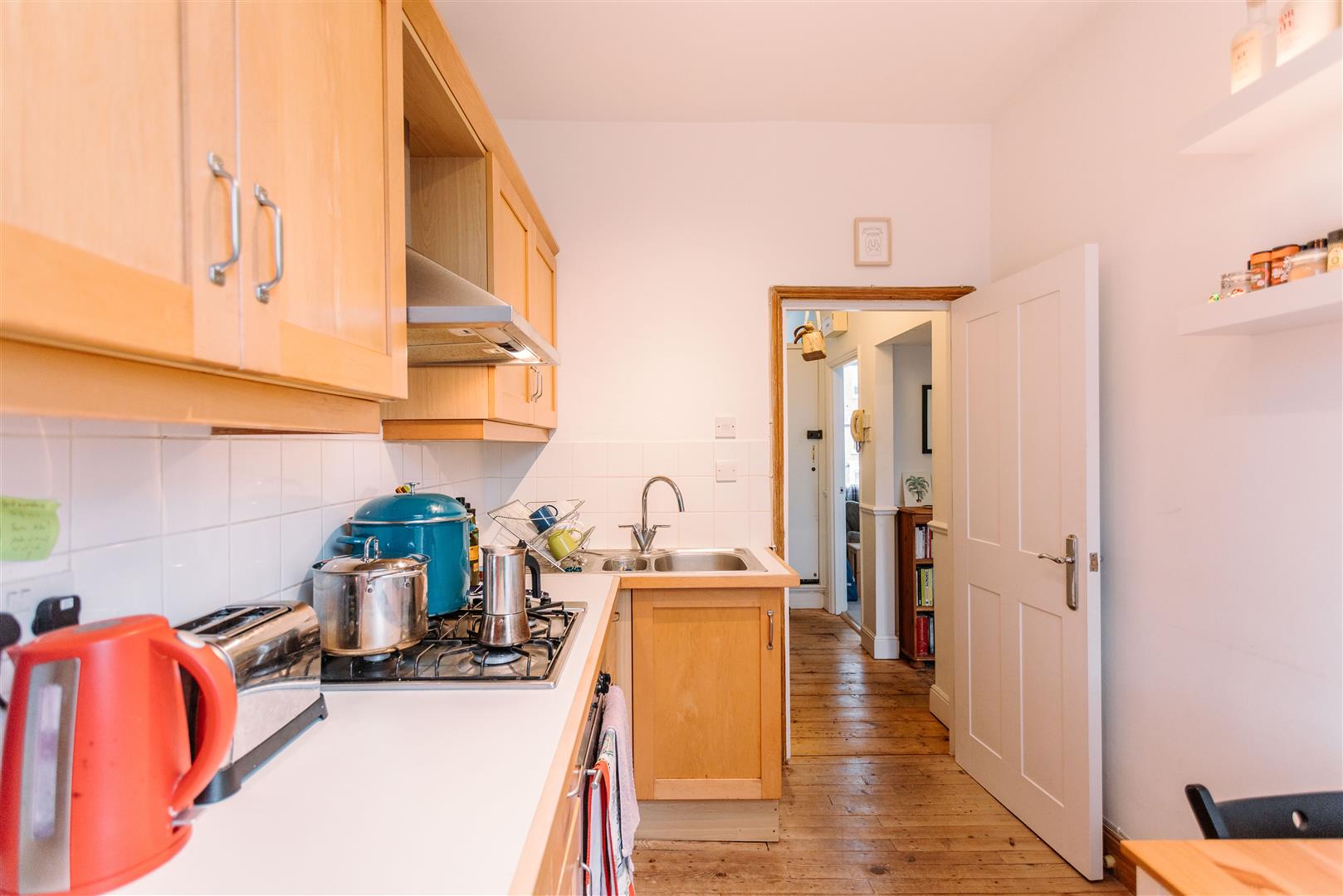 The kitchen is positioned just off the reception room and is well laid out, featuring warm wood cabinetry, integrated oven and hob, ample worktop space and room for a small dining table by the window.