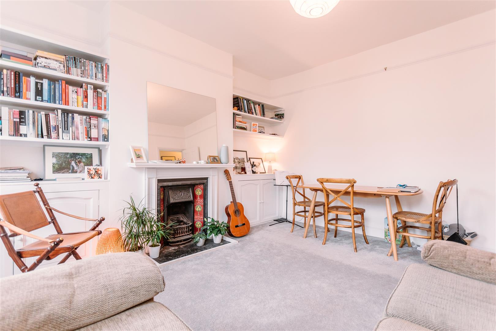The reception room is wide, airy and filled with natural light from large sash windows. Soft neutral tones, fitted shelving and a character fireplace create a calm, welcoming room with plenty of space for both living and dining, ideal for everyday life or entertaining.